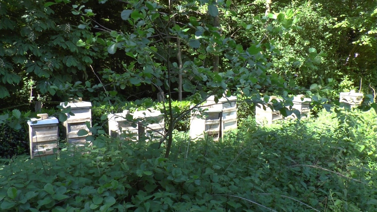 Abb. 4. Blick auf die Völker des Bienenstandes CD am 22. Juli 2020 vor der Sommerhonigernte. Die Wirtschaftsvölker stehen in einer Reihe im Bild von rechts vorne (Volk 1) nach links. Zwischen den Völkern 1 und 2 stehen zwei einzargige Jungvölker, zwischen den Völkern 3 und 4 steht ein drittes Jungvolk. Die Völker 3 und 4 sitzen in 3 Zargen, die anderen Völker in 4 Zargen.