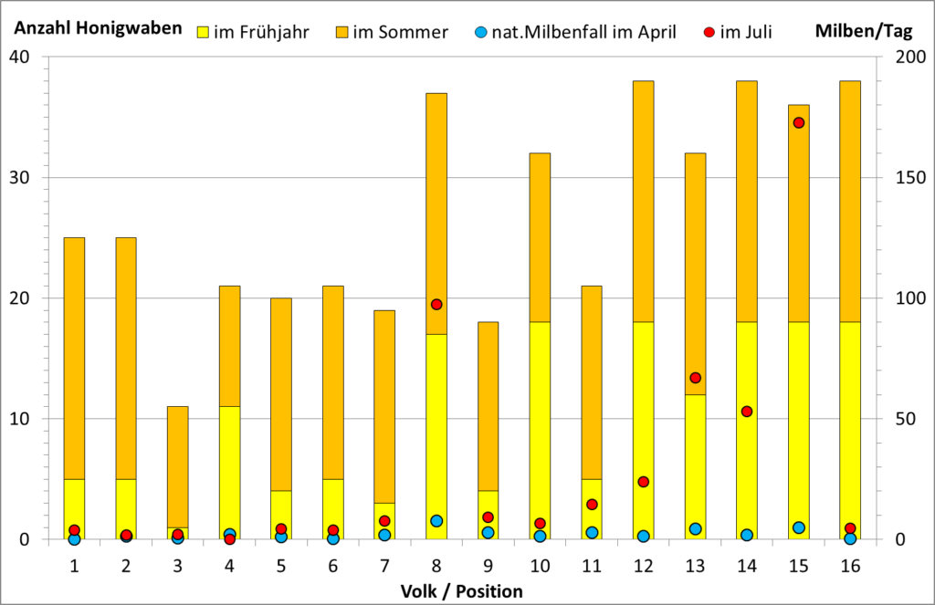 Abb. 5. Der Vergleich des natürlichen Milbenfalls im April und Juli mit der Anzahl der im Frühjahr und im Sommer geernteten vollen Honigwaben am Bienenstand CD. Die „hinten“ länger im Schatten stehenden Völker 12-16 haben besonders im Frühjahr mehr Honig gemacht als die vorne länger in der Sonne stehenden Völker. Die Sammelleistung während der Sommertracht ist nicht von der Position abhängig. Besonders auffällig ist der Unterschied im natürlichen Milbenfall zwischen den nahe beieinander stehenden Völkern 15 und 16.