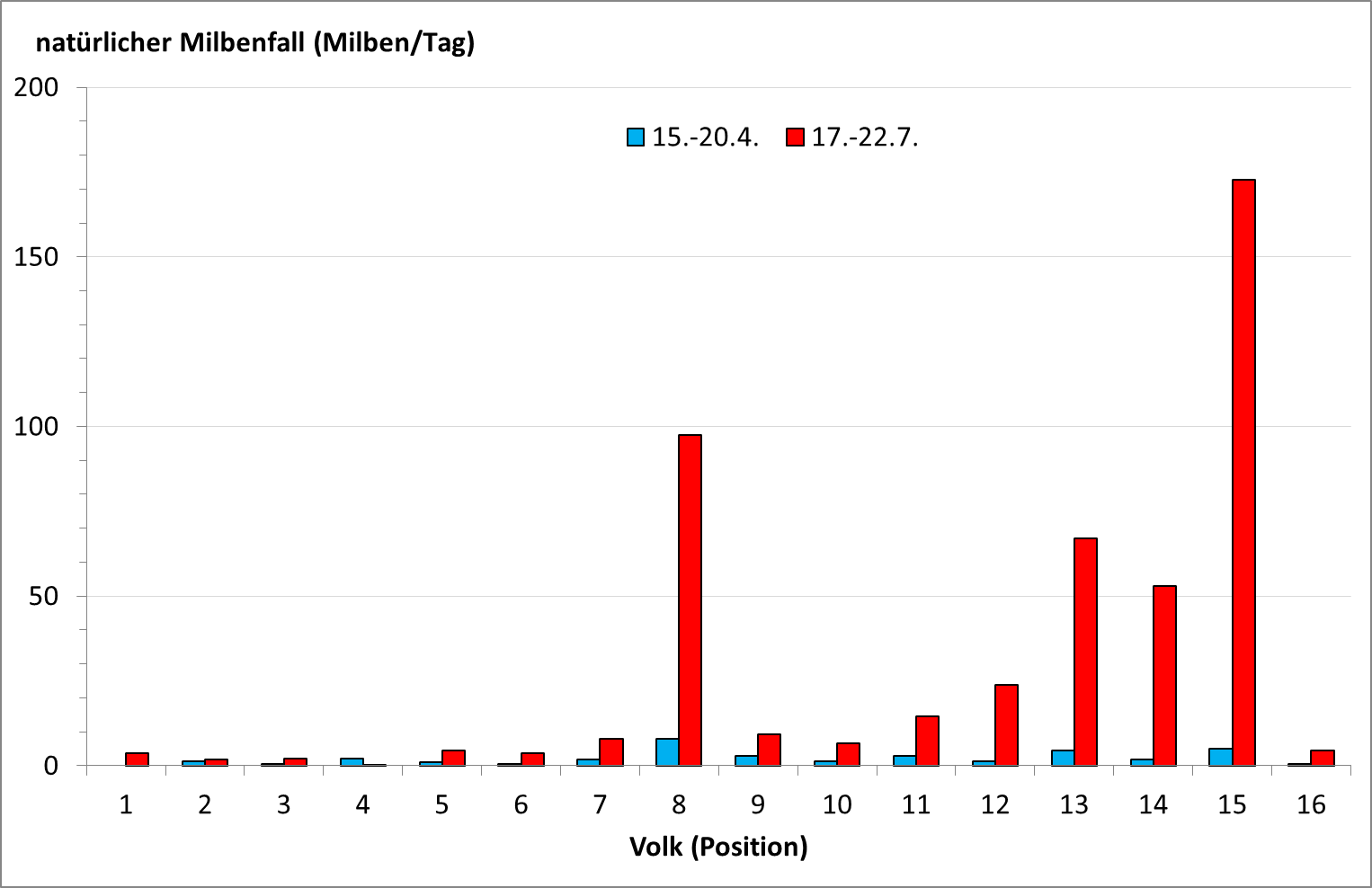 Abb. 3. Der natürliche Milbenfall der Wirtschaftsvölker am Stand CD. Die Völker stehen am Nordost-Rand eines Laubwaldes. Die Sonne scheint nur am frühen Vormittag auf die Fluglöcher. Am längsten Sonnenlicht erhält Volk 1, am wenigsten Sonnenlicht Volk 16 (vgl. Abb. 4, 6 und 7).