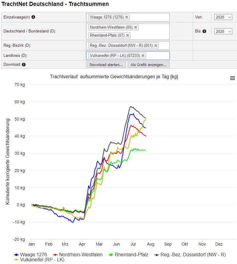Abb. 1 Der Trachtverlauf in 2020 bis zum 23. Juli. Quelle: https://dlr-web-daten1.aspdienste.de/cgi-bin/tdsa/tdsa_client.pl. Die Waage 1276 steht am Bienenmuseum Duisburg, das Waagstockvolk wird vom Verfasser betreut. Waage 1276 ist eine der 54-59 Waagen, mit denen in Nordrhein-Westfalen, bzw. eine der 18-20 Waagen, mit denen im Regierungsbezirk Düsseldorf der Trachtverlauf verfolgt wird. In Rheinland-Pfalz sind 145-148 Waagen im Einsatz, von denen 6 Waagen in der Vulkan-Eifel stehen. Dort zeigen die Waagen auch im Juli noch Zunahmen, eventuell bedingt durch eine Honigtautracht?