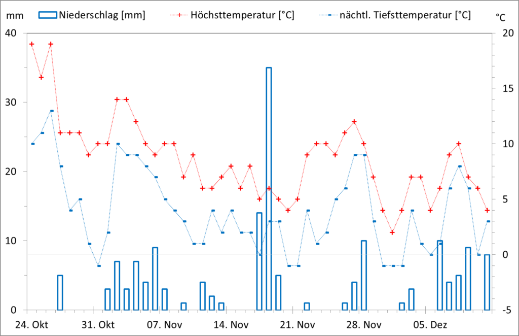 Abb. 2. Die Wetterdaten der Wetterstation Essen vom 24. Oktober bis zum 11. Dezember 2019. Die Daten sind dem „Wetterrückblick Bochum“ entnommen, der auf der Website https://www.wetteronline.de/wettertrend/bochum zu finden ist.