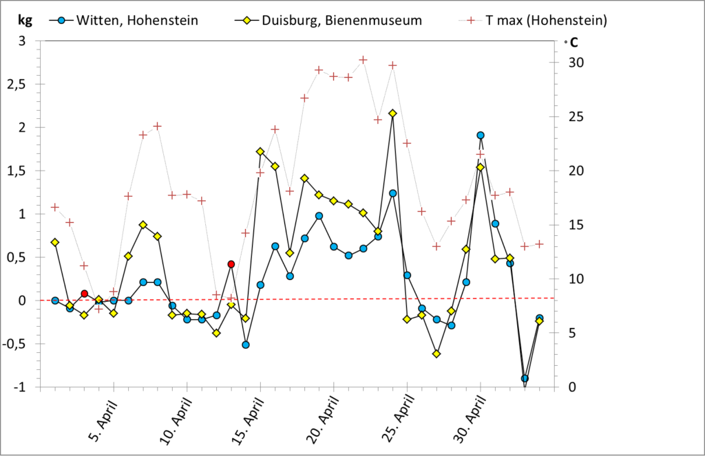 Abb. 1. Die tägliche Gewichtsveränderung des Waagstockes am Lehrbienenzentrum Hohenstein und am Bienenmuseum Duisburg im April und Anfang Mai im Vergleich mit den am Waagstock Hohenstein registrierten Temperatur-Maxima („T max“). Die Gewichtszunahmen am Hohenstein am 3. April und am 13. April (rot markiert) sind wahrscheinlich auf Regenfall zurückzuführen. Der auf der Blechhaube des Volkes liegende Stein ist mit Moos bewachsen, das vorübergehend Regenwasser speichert, was den Stein vorübergehend schwerer macht.