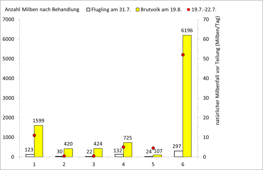 Am 29. Juli wurden die Völker geteilt, die Fluglinge wurden am 31. Juli behandelt, die Behandlung der dann brutfreien „Brutvölker“ folgte am 19. August. Sie verloren durch die Behandlung deutlich mehr Milben als ihre „Fluglinge“ drei Wochen zuvor. Das war nicht anders zu erwarten; denn die meisten Milben halten sich in der Brut und auf den Ammenbienen auf und verbleiben bei der Volksteilung im „Brutvolk“.