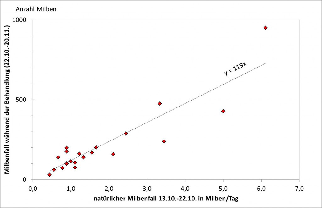 Im Gemüll fast aller 97 Völker waren neben den dunklen Milben auch helle Milbenstadien zu finden (Bild 1). Sie fallen beim Schlupf befallener Brut an. Auf diesen Umstand sollte man bei den bevorstehenden Gemülldiagnosen achten. Solange helle Milbenstadien im Gemüll landen haben die Völker noch Brut. Dann liegt der Umrechnungsfaktor, mit dem man vom natürlichen Milbenfall auf die Anzahl der Varroamilben im Volk hochrechnet, auch deutlich niedriger als bei brutfreien Völkern (Abb. 2).