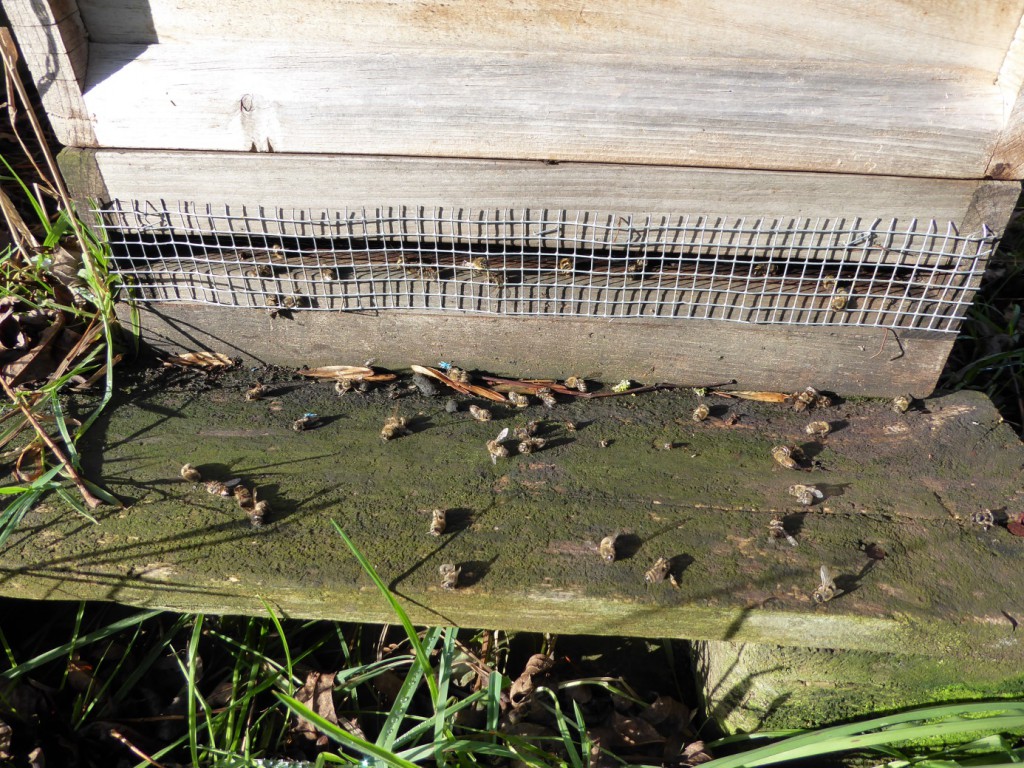 Zwei Völker waren brutfrei. Die Völker mit der meisten Brut haben offensichtlich auch die meisten Milben (Abb. 1). Bei keinem Volk waren Varroaschäden zu erkennen, an der Brut nicht, an den Bienen nicht und es gab keinen übermäßig hohen Bienentotenfall auf dem Gitterboden und auch kein Totenfall am Flugloch (Bild 2).