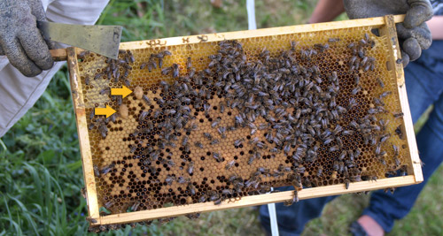 Zu erkennen sind die hervorstehenden Drohnenzellen zwischen der Arbeiterinnenbrut.